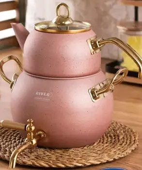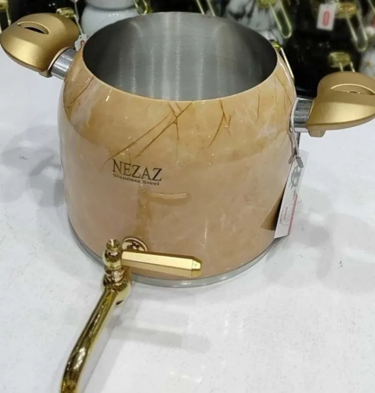 کتری قوری شیرداربرند نزاز طرح ماربل ترکیب بدنه طرح ماربل سنگی با قوری و یراقآلات طلایی براق، این محصول را به انتخابی ایدهآل برای خانههای مدرن، جهیزیه عروس و پذیراییهای رسمی تبدیل کرده است.