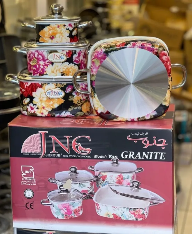 سرویس قابلمه و ماهیتابه گلدار برند جنوب انتخابی کاربردی و خوشطرح برای آشپزخانههای ایرانی است. این سرویس با طراحی گلدار زیبا و پوشش نچسب گرانیتی، هم ظاهر چشمنوازی دارد و هم پختوپز را سادهتر و سالمتر میکند.
